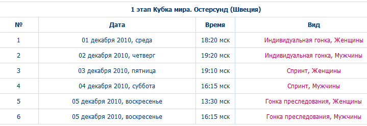 maksimss писал(а):Стрельба:1- Андреа Хенкель 2- Хелена Йонссон 3- Оксана Хвостенко 4-Тея Грегорин 5-Тура Бергер 6-Дарья Домрачева 7-Анна-Карин Олофссон 8-Валя Семеренко 9- Светлана Слепцова 10- Елена Хрусталева
