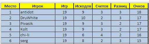 Dima_Apatity писал(а):sheva писал(а):Dima_Apatity писал(а):Может конечно где то про это и сказано, все не перечитаешь, но кто нибудь скажет, как ведется подсчет? Судя по таблице, никакой логики не нашел. Хоть и в заглавном посте написано, что подсчет стандартный.